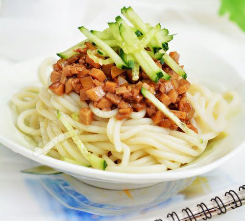 16.鍋中放水,水開后放入面條煮熟,撈出過涼水,放上杏鮑菇肉醬,撒上些黃瓜絲,就可以開吃了