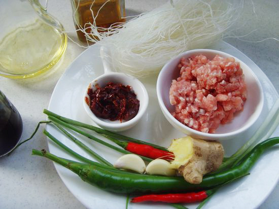 輔料:豬肉餡50克、蔥、姜、蒜、青紅辣椒