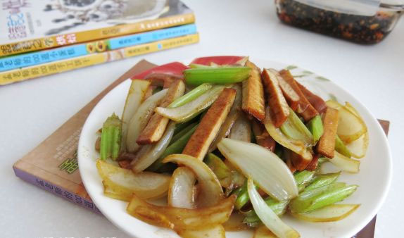 1、 準(zhǔn)備材料:豆干一塊、洋蔥一頭、芹菜若干