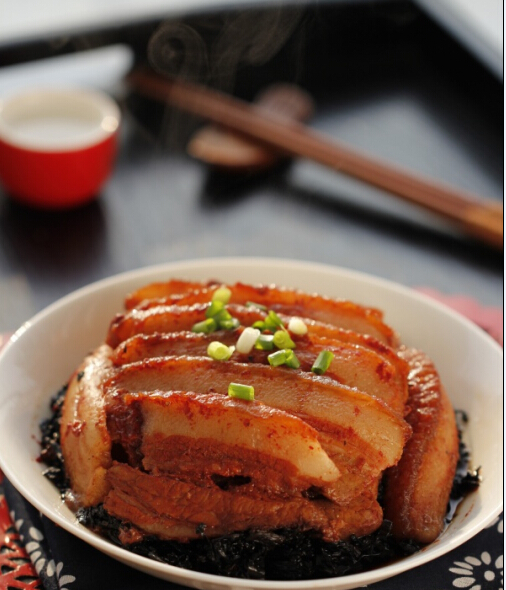 19. 最后再表面上撒些小蔥末, 這樣色香味誘人的大年菜“梅菜扣肉”就完成了。